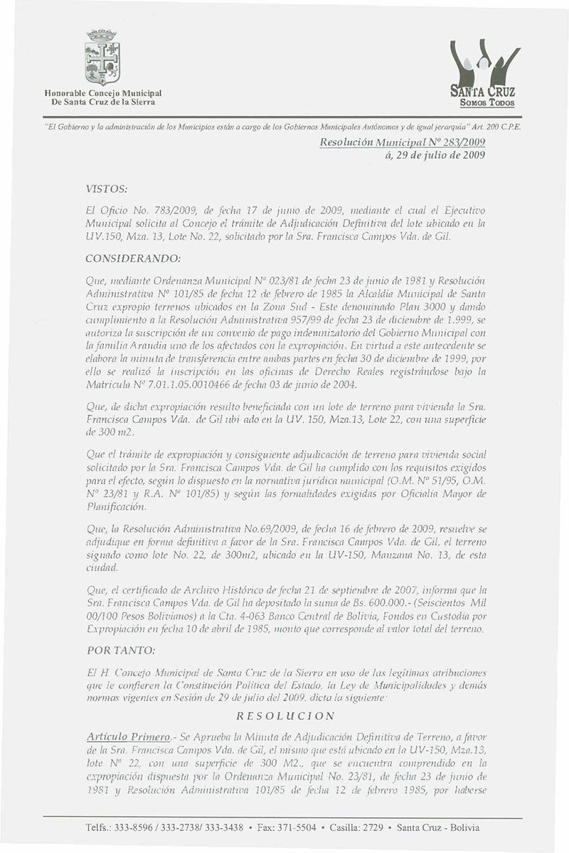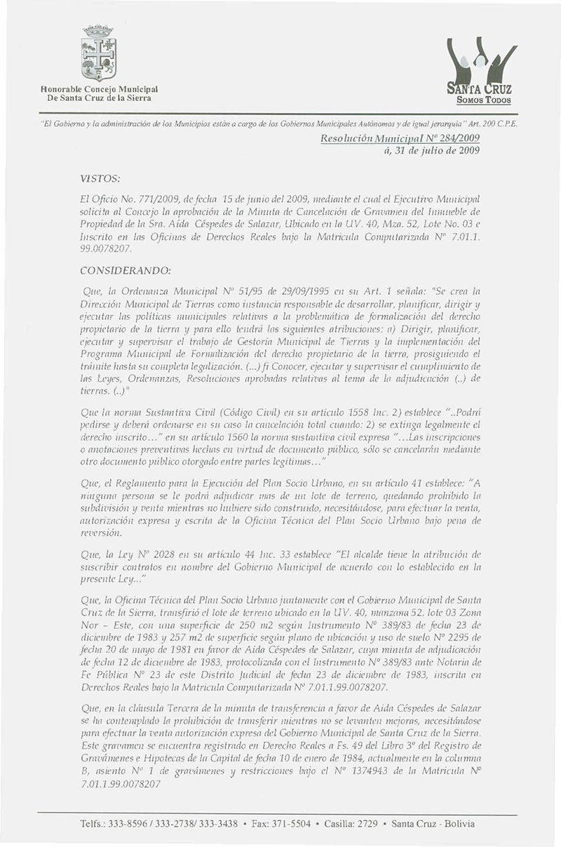 Aprueba la Minuta de Cancelación de Gravamen, del Terreno ubicado en la UV-40 Mza 52, lote No 3 con una superficie de 257 Mts², a suscribirse entre la propietaria Sra. Aída Céspedes de Salazar y el Gobierno Municipal de Santa Cruz de la Sierra.