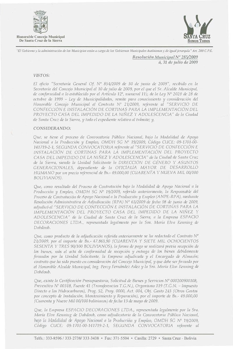 Aprueba el Contrato No 21/2009, por el importe de Bs.- 47,863,90 referente al "Servicio de Confección e instalación de cortinas para la implementación del proyecto Casa del Impedido de la Niñez y Adolescencia.