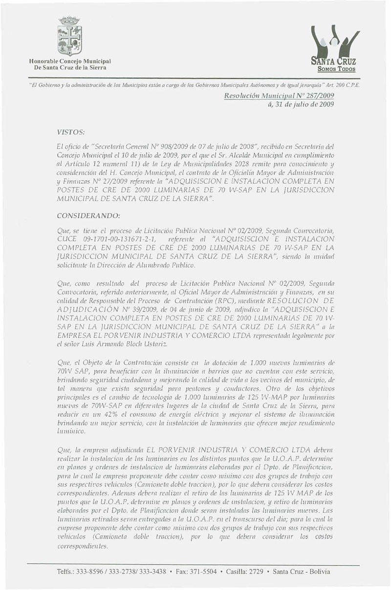 Aprueba el Contrato No 27/2009, por el monto total de Bs.- 2,100.000.- para la "Adquisición e instalación completa en postes de CRE de 2000 luminarias de 70 W-SAP en la jurisdicción Municipal de Santa Cruz de la Sierra.
