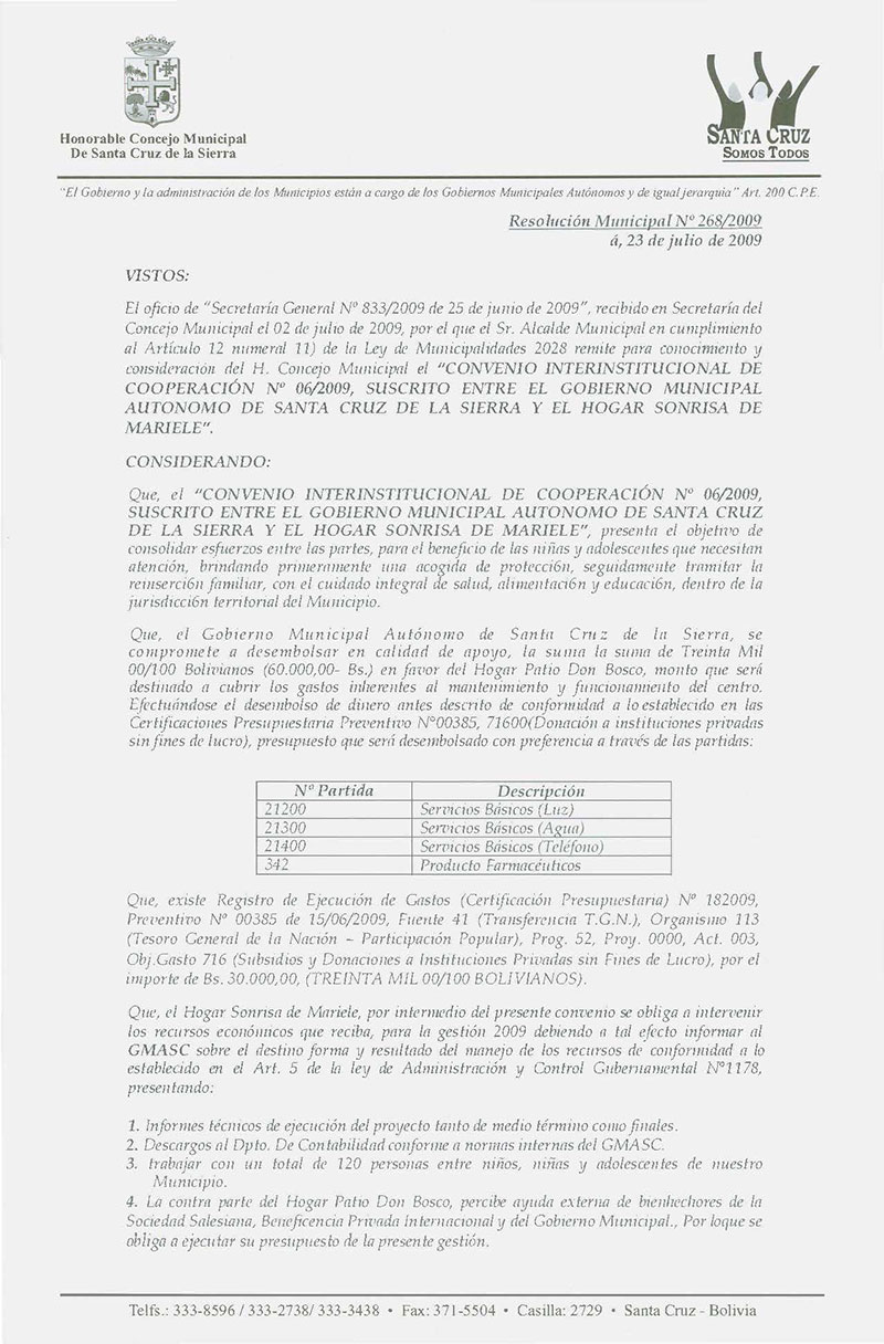 Aprueba el "Convenio Interinstitucional de Cooperación No 06/2009" suscrito entre el Gobierno Municipal de Santa Cruz de la Sierra y el Hogar Sonrisa de MARIELE.