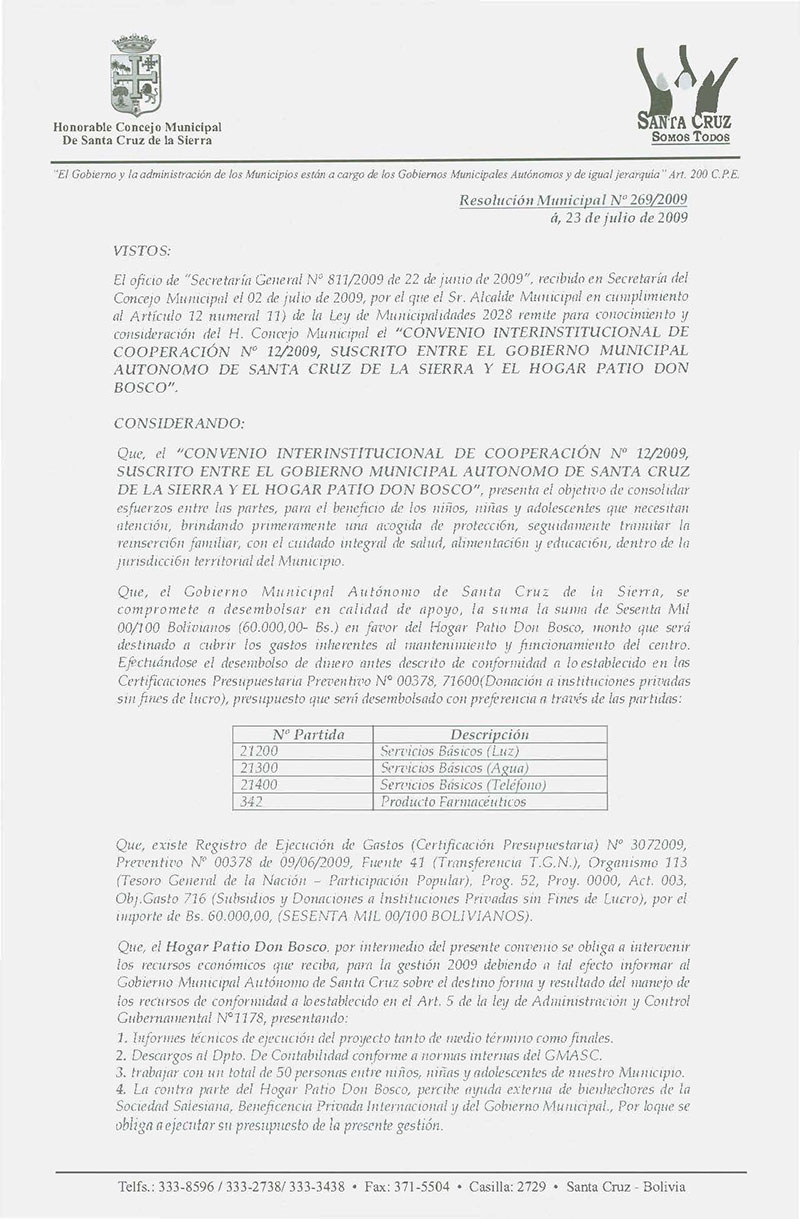 Aprueba el "Convenio Interinstitucional de Cooperación Nº 12/2009", suscrito entre el Gobierno Municipal y el Hogar Patio Don Bosco.