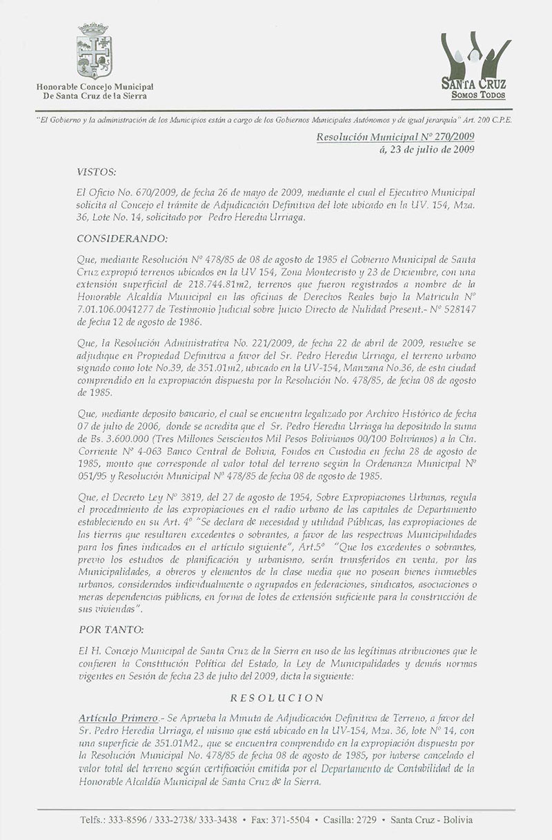 Aprueba la Minuta de adjudicación definitiva de Terreno, a favor del Sr. Pedro Heredia Urriaga, el mismo que esta ubicado en la UV-154, Mza 36, lote 14 con una superficie de 351,01 mts².