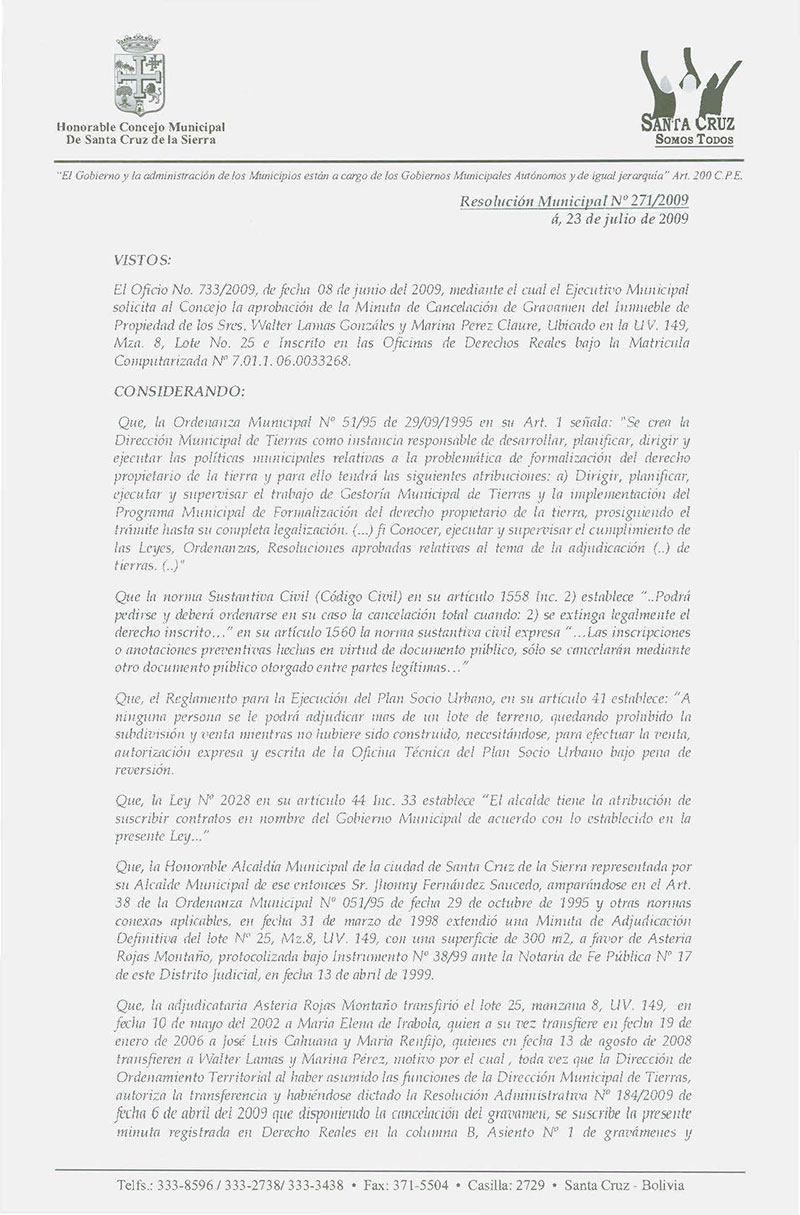 Aprueba la Minuta de Cancelación de Gravamen, del Terreno ubicado en la UV-149, Mza 8, lote 25, con una superficie de 300 Mts². a suscribirse entre los propietarios Walter Lamas González y Marina Pérez Claure.