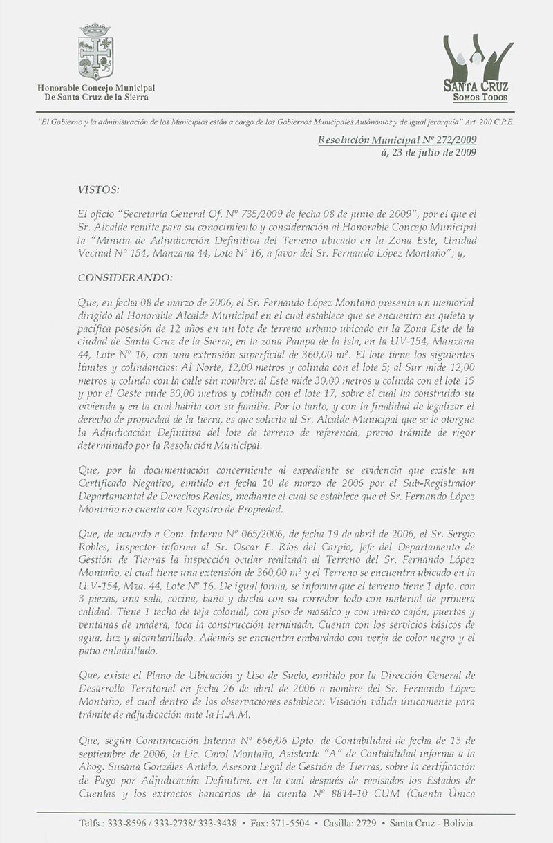 Aprueba la Minuta de Adjudicación definitiva del Terreno ubicado en la Zona Este, Unidad vecinal No 154, Mza 44, lote N° 6, a favor del Sr. Fernando López Montaño, con una superficie de 360,000 mts².