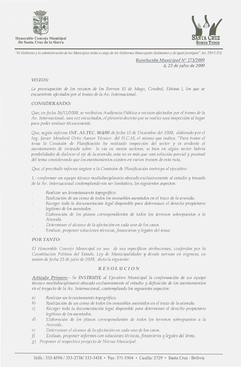 Instruye al Ejecutivo Municipal la conformación de un equipo técnico multidisciplinario abocado exclusivamente al estudio y definición de los asentamientos en el trayecto de la Av. Internacional, contemplando los incisos expresados en la Resolución.
