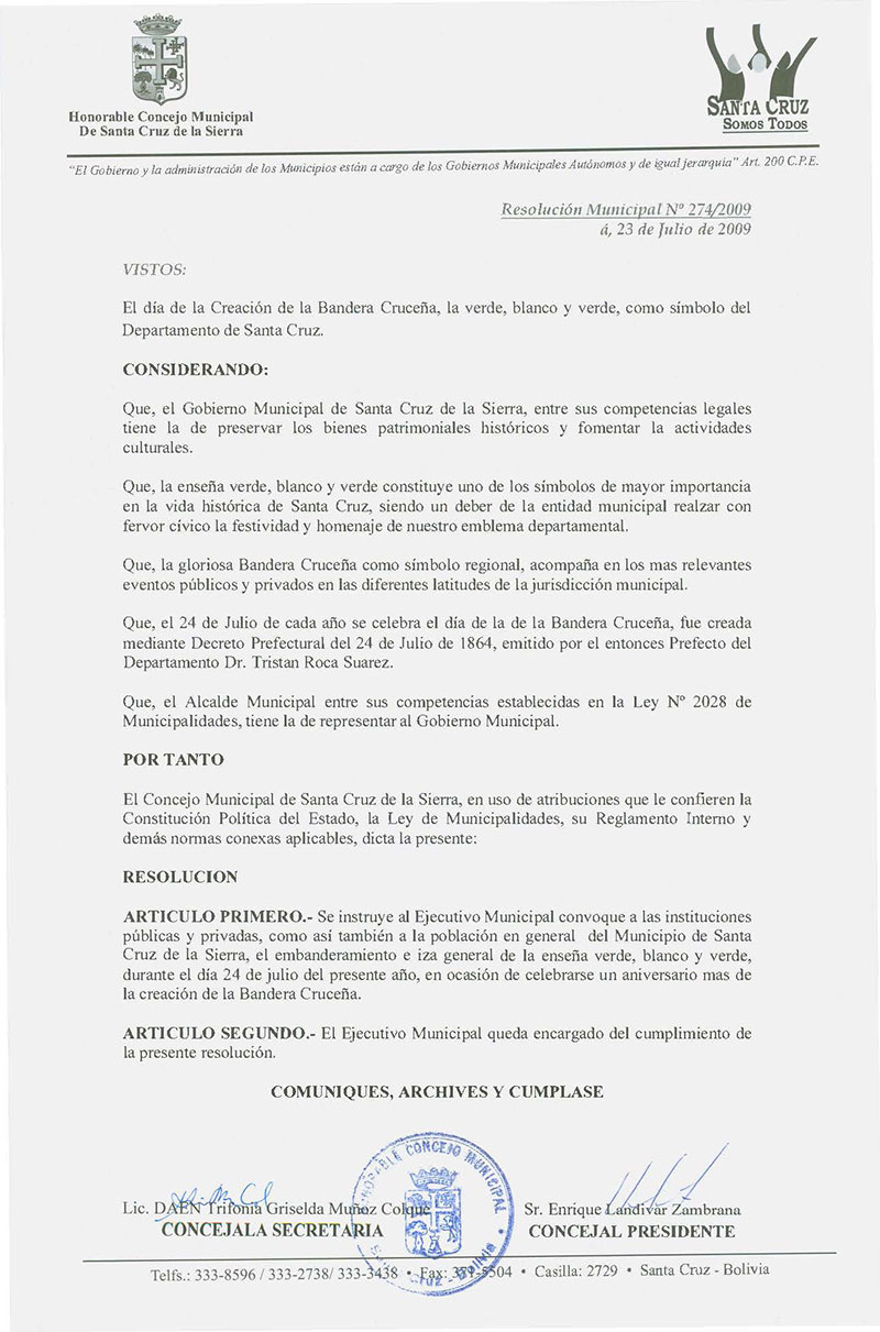 Instruye al Ejecutivo Municipal convoque a las instituciones públicas y privadas, como así también a la población en general del Municipio de Santa Cruz de la Sierra, el embanderamiento e iza de la enseña verde, blanco y verde, durante el día 24 de julio del presente año, en ocasión de celebrarse un aniversario mas de la creación de la Bandera Cruceña.