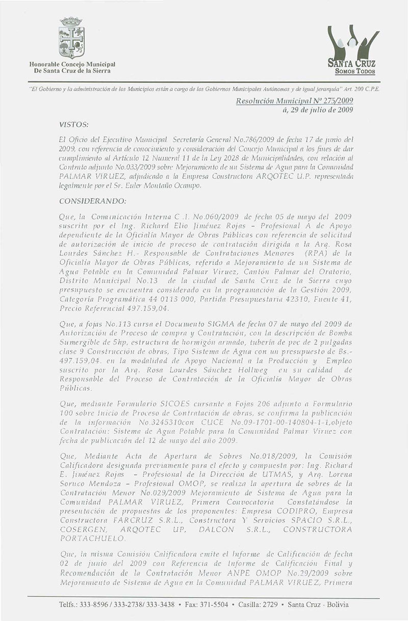 Aprueba el Contrato de Oficialía Mayor de Obras Públicas ANPE N° 33/2009 para el mejoramiento del Sistema de agua potable para la Comunidad Palmar Viruez, Distrito N° 13, Cantón Palmar del Oratorio de la Ciudad de Santa Cruz de la Sierra, por un monto de Bs.- 428,808,76.
