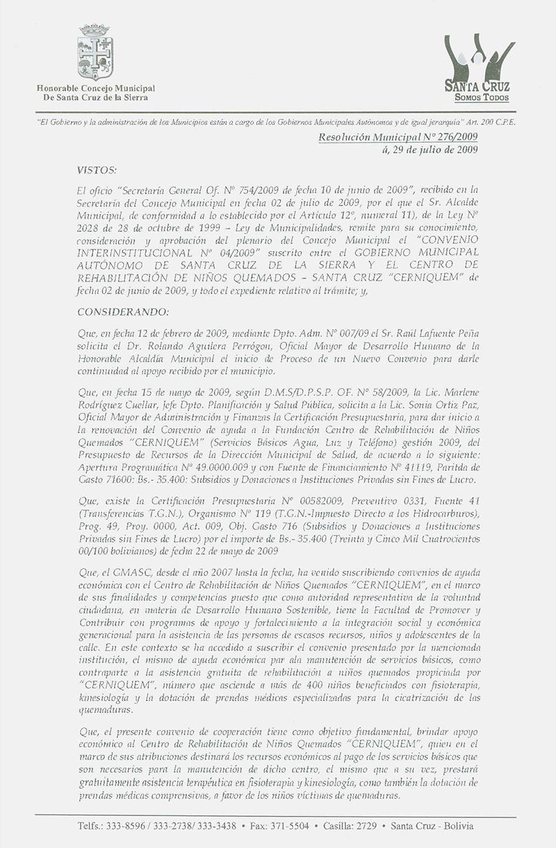 Aprueba el "Convenio Interinstitucional No 04/2009" suscrito entre el GM y el Centro de Rehabilitación de Niños quemados - Santa Cruz "CERNIQUEM".
