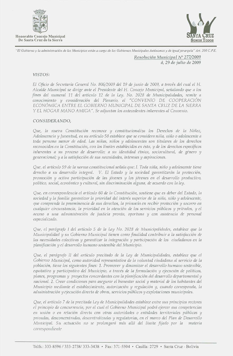 Aprueba la suscripción del Convenio Interinstitucional de Cooperación No 13/2009, suscrito entre el Gobierno Municipal de Santa Cruz de la Sierra y el Hogar Mano Amiga.