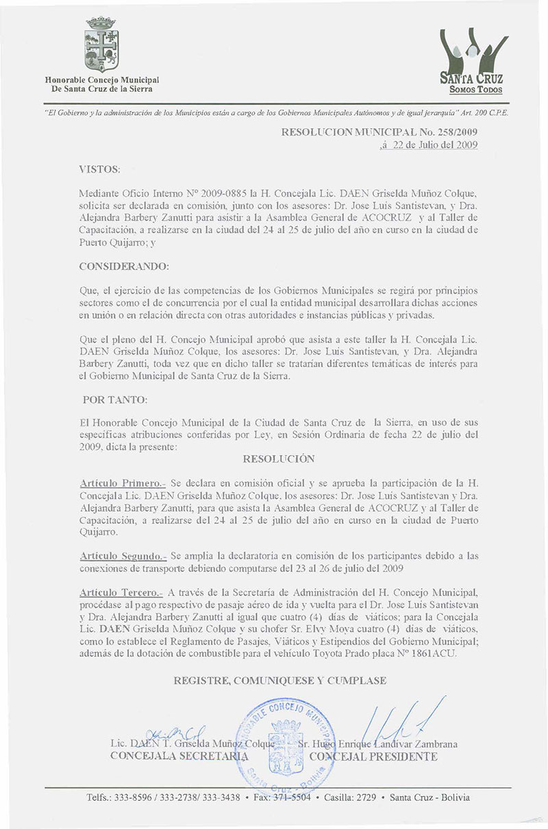 Declara en Comisión Oficial y se Aprueba la participación de la H. Concejala Lic. DAEN Griselda Muñoz Colque, los Asesores José Luís Santistevan y Dra. Alejandra Barbery Zanutti para que asistan la Asamblea General de ACOCRUZ y al Taller de Capacitación a realizarse del 24 al 25 de julio del año en curso en la Ciudad de Puerto Quijarro.