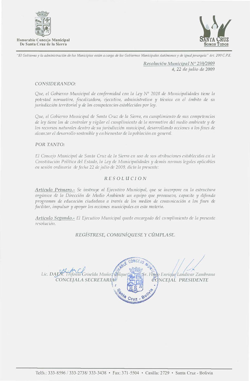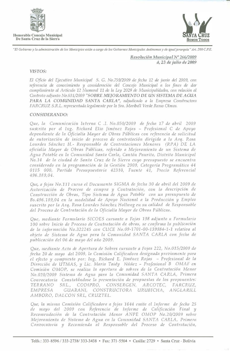Aprueba el Contrato de la Oficialía Mayor de Obras Publicas No 31/209 para el "Mejoramiento del Sistema de Agua potable para la Comunidad de Santa Carla Distrito Municipal No 14 de la Ciudad de Santa Cruz.