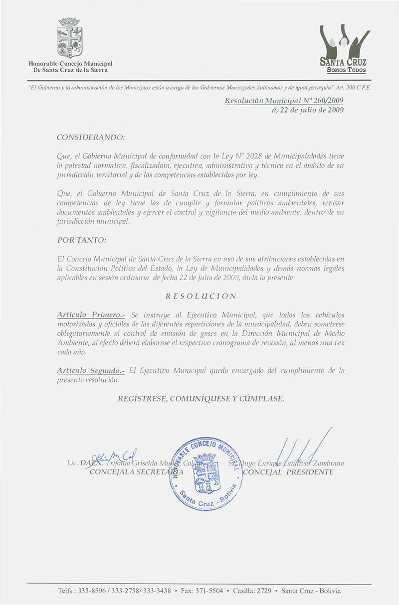 Instruye al Ejecutivo Municipal, que todos los vehículos motorizados y oficiales de las diferentes reparticiones de la municipalidad, deben someterse obligatoriamente al control de emisión de gases en la Dirección Municipal de Medio Ambiente.