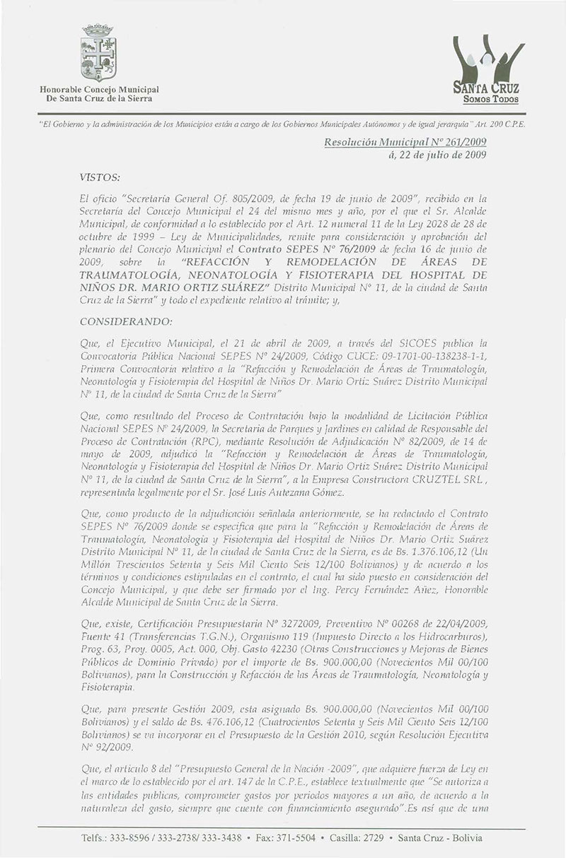 Aprueba el Contrato SEPES No 76/2009 por el monto de Bs.- 1.376.106,12 para la "Refacción y remodelación de áreas de traumatología, neonatología y fisioterapia del Hospital de niños Dr. Mario Ortiz Suárez Distrito No 11.