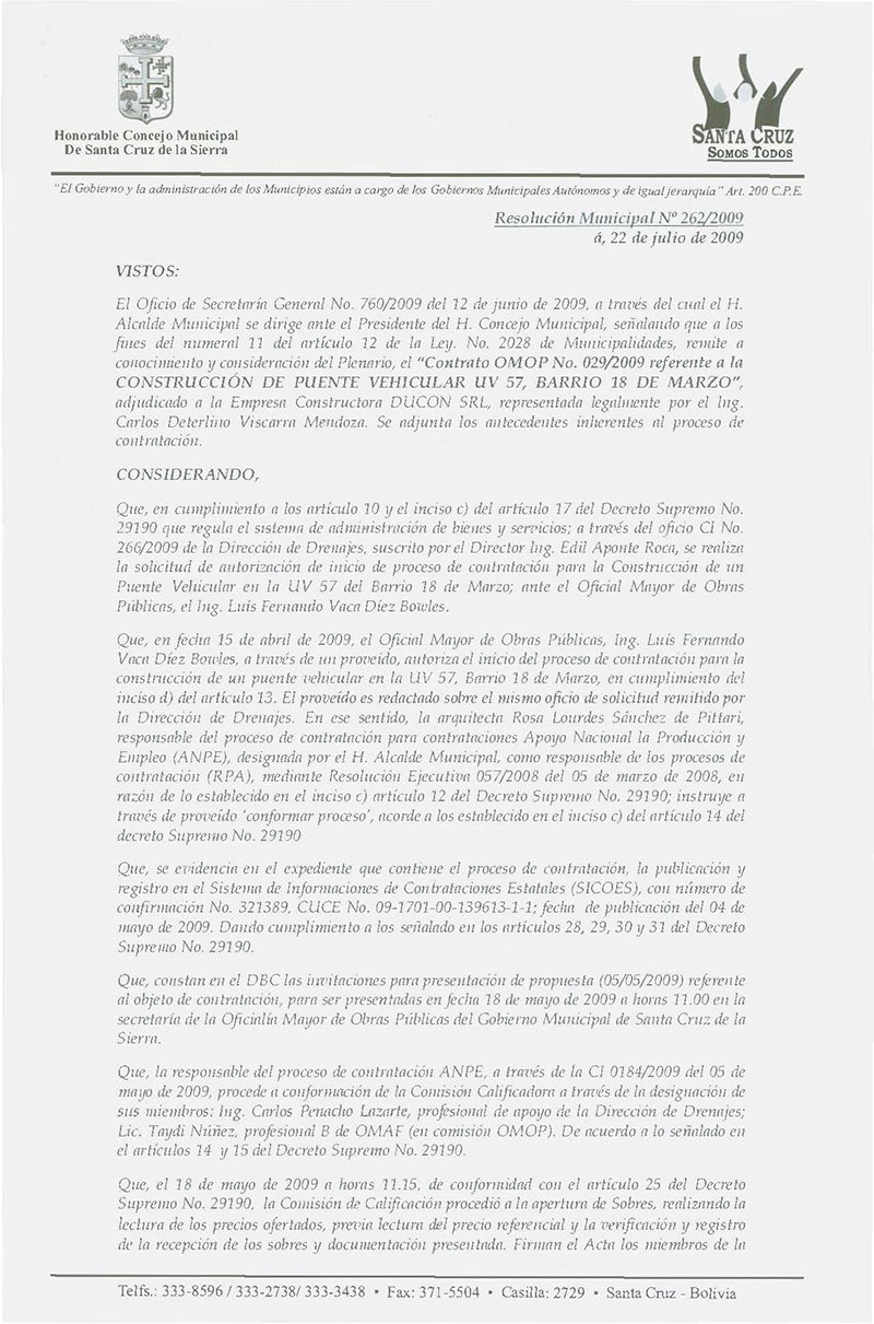 Aprueba el Contrato OMOP No 029/2009 "Construcción del puente vehicular UV. 57, Barrio 18 de marzo adjudicado a la Empresa Constructora DUCON S.R.L.