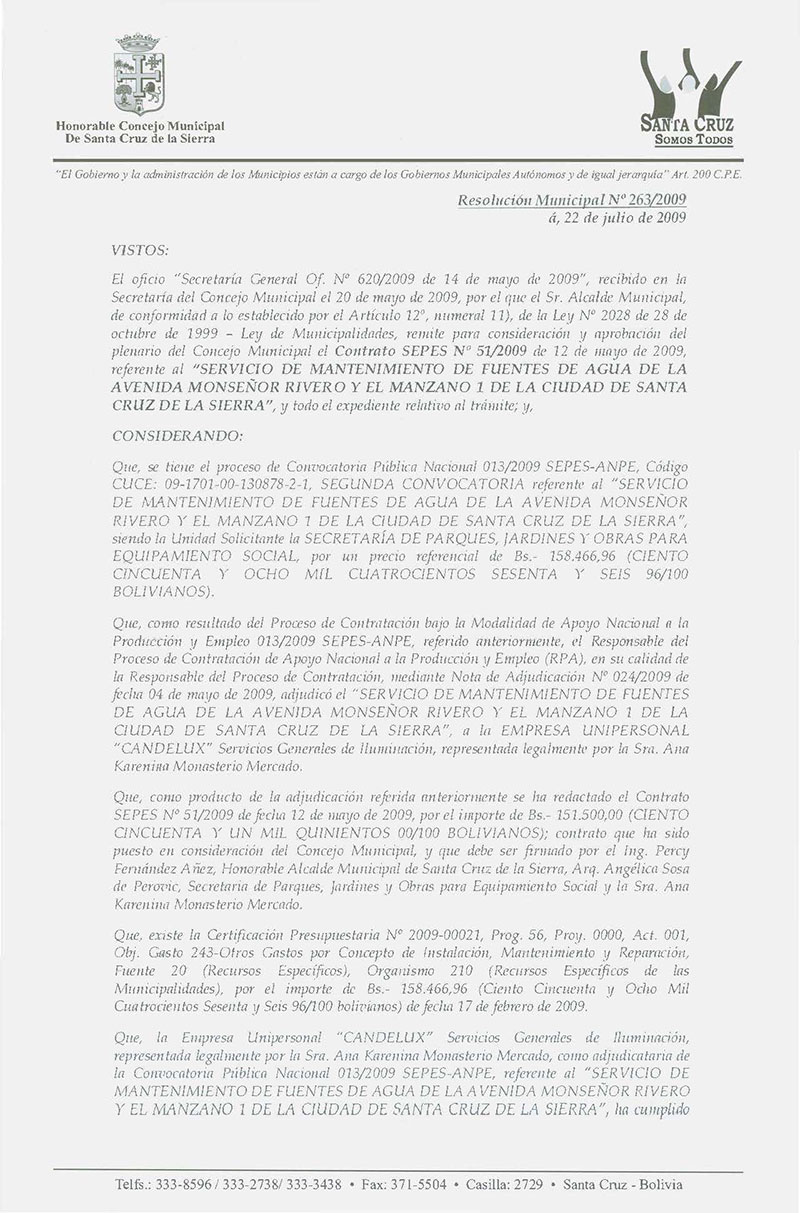 Aprueba el Contrato SEPES N° 51/2009 para el "Servicio de Mantenimiento de Fuentes de Agua de la Av. Monseñor Rivero y el Manzano 1 de la ciudad de Santa Cruz de la Sierra.