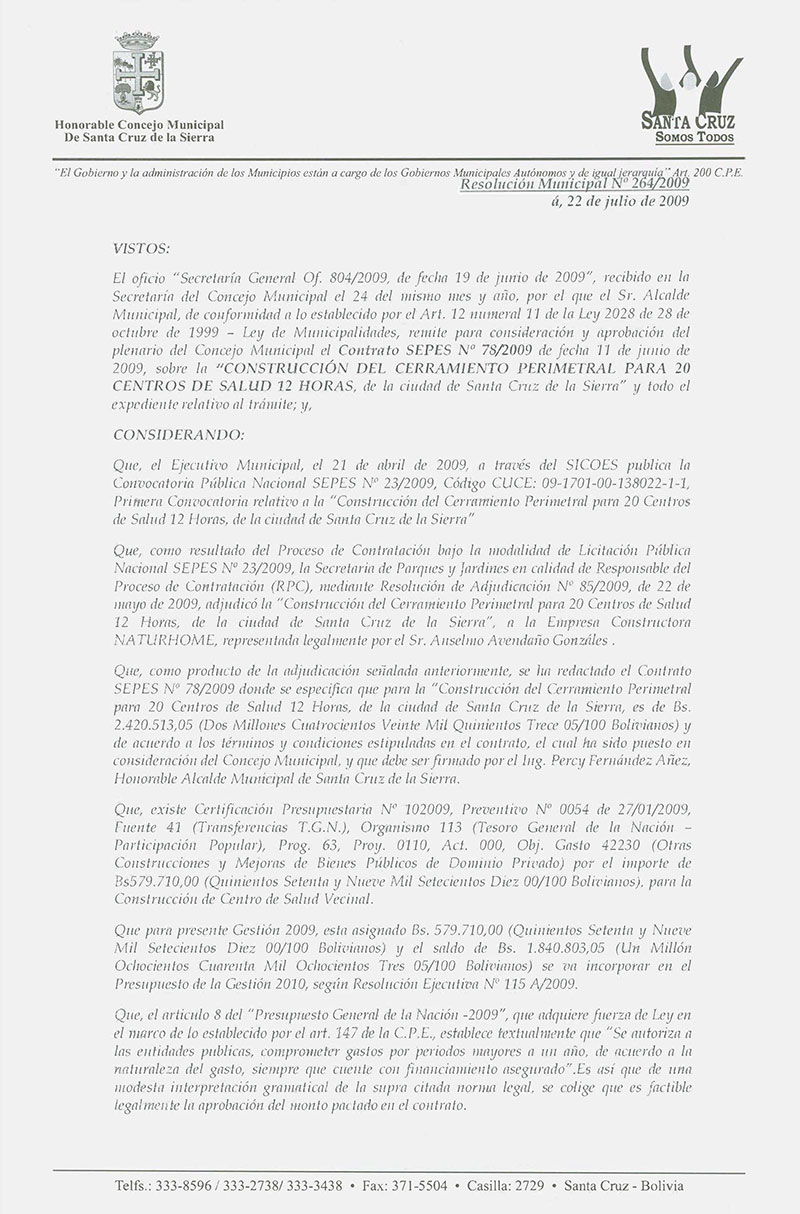 Aprueba el Contrato SEPES No 78/2009 para la "Construcción del Cerramiento Perimetral para 20 Centros de Salud 12 horas de la ciudad de Santa Cruz de la Sierra.