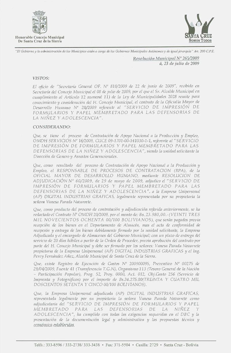 Aprueba el Contrato de la Oficialía Mayor de Desarrollo Humano No 20/2009 para el "Servicio de impresión de formularios y papel membretado para las Defensorías de la niñez y adolescencia.