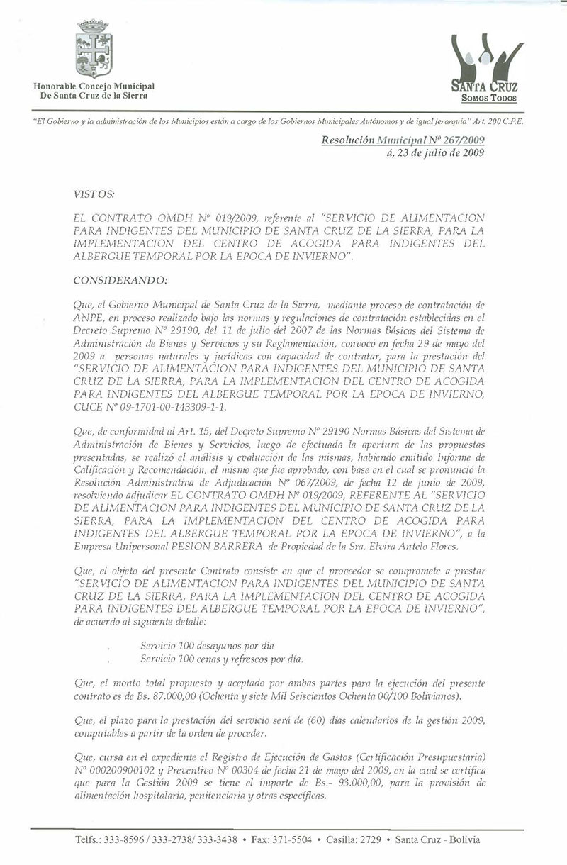 Aprueba el Contrato OMDH N° 19/2009 referente al "Servicio de Alimentación para indigentes del Municipio de Santa Cruz de la Sierra, para la implementación del Centro de Acogida para indigentes del albergue Temporal por la época de invierno.