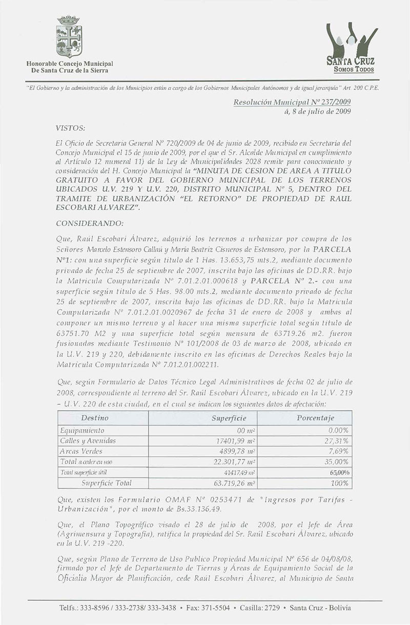 Se aprueba la "Minuta de Cesión de área a título gratuito a favor del Gobierno Municipal de los Terrenos ubicados en la UV. 219 y UV. 220, Distrito Municipal N° 5, dentro del trámite de Urbanización "El Retorno" de propiedad de Raúl Escobari Álvarez.