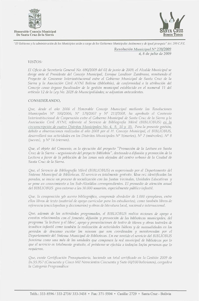 Se Aprueba el Convenio Interinstitucional de Cooperación entre el Gobierno Municipal de Santa Cruz de la Sierra y la Asociación Civil AYNI Bolivia, referente al Servicio de Bibliografía Móvil en los Distritos.