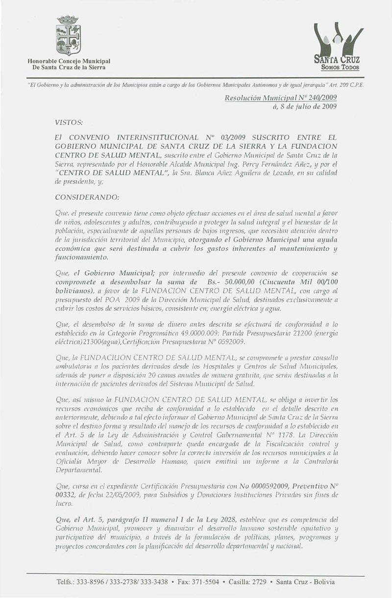 Se aprueba el Convenio Interinstitucional N° 03/2009 suscrito entre el Gobierno Municipal de Santa Cruz de la Sierra y la Fundación Centro de Salud Mental.