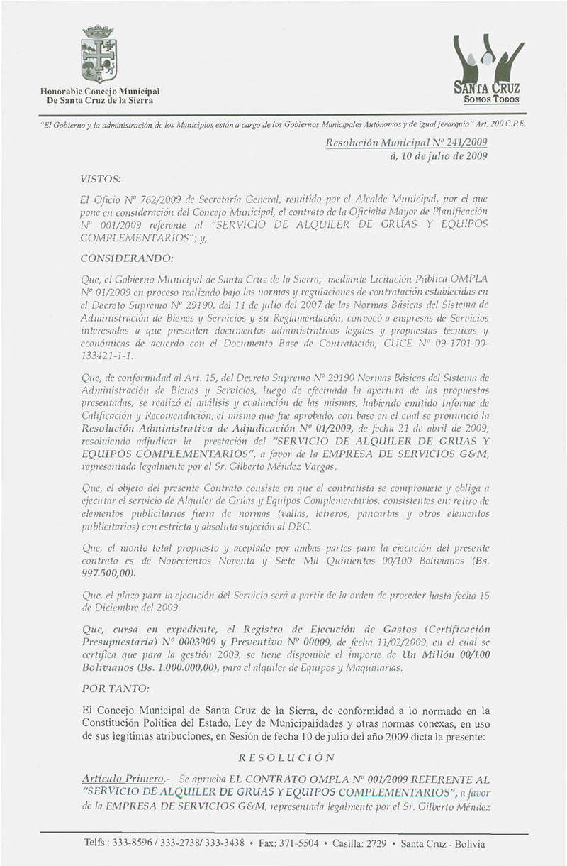 Se aprueba el Contrato OMPLA N° 001/2009 referente al "Servicio de Grúas y Equipos Complementarios", adjudicado a favor de la Empresa de Servicios G.