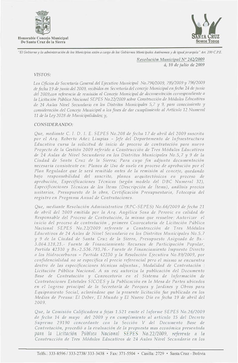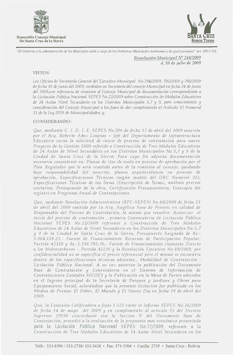 Aprobar el Contrato SEPES N° 66/2009, referido a la "Construcción de un Módulo Educativo de 24 aulas nivel secundario en el Distrito Municipal N° 5 Paquete N° 1 de la Ciudad de Santa Cruz por Bs. 5.733.834,98.