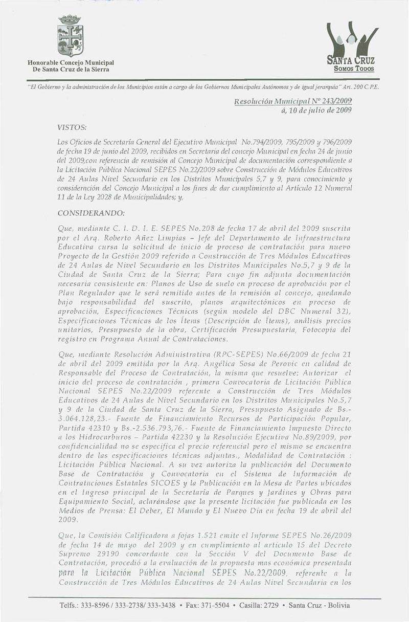 Aprobar el Contrato SEPES No 68/2009, referido a la "Construcción de un Módulo Educativo de 24 aulas nivel secundario en el Distrito Municipal N° 9 Paquete N° 3 de la Ciudad de Santa Cruz de la Sierra por Bs. 6.005.091,24.