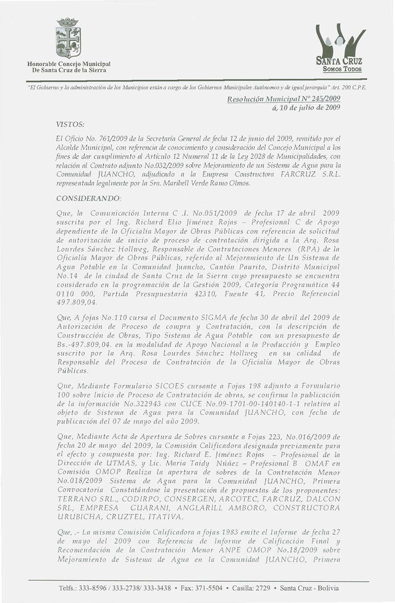 Aprueba el Contrato OMOP ANPE No 032/2009 para el Mejoramiento del Sistema de agua potable para la comunidad JUANCHO, Distrito Municipal N° 14 de la ciudad de Santa Cruz de la Sierra.