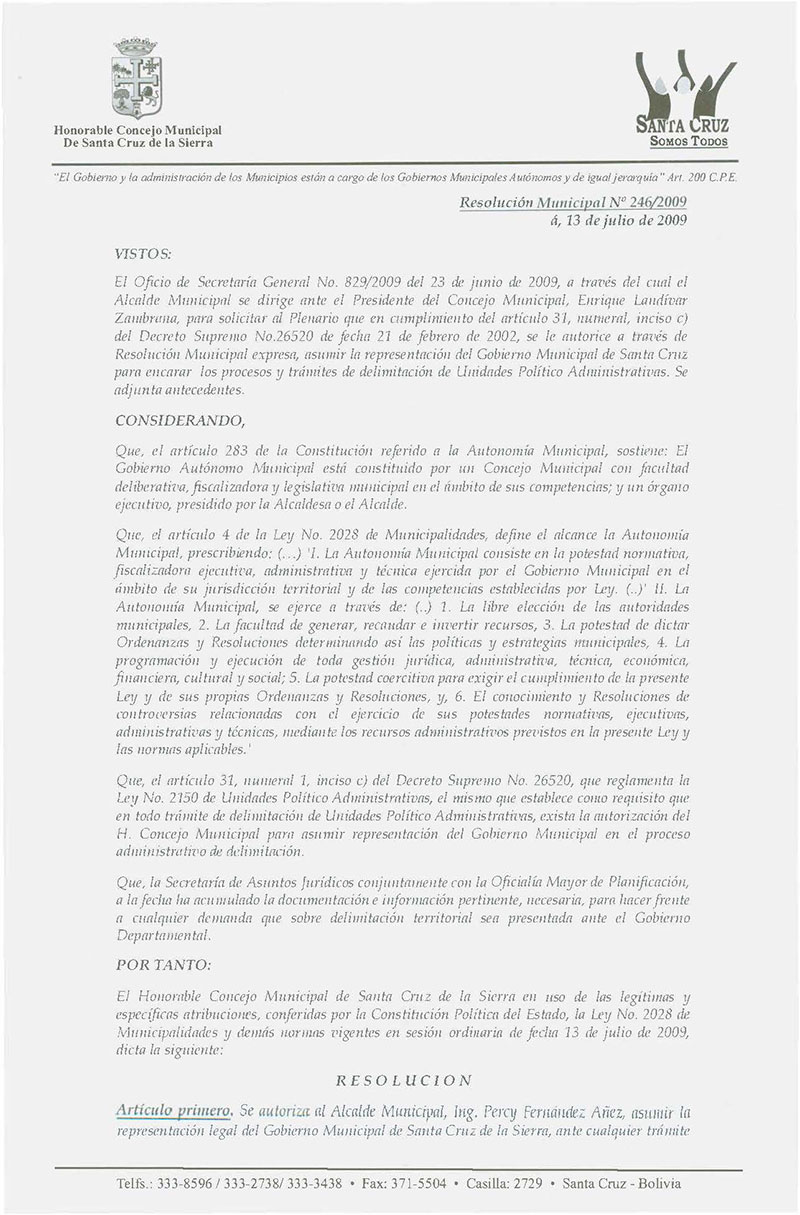Autoriza al Alcalde Municipal Ing. Percy Fernández, asumir la representación legal del Gobierno Municipal, ante cualquier trámite o proceso administrativo de delimitación en el marco de las disposiciones establecidas en la Ley No 2150.