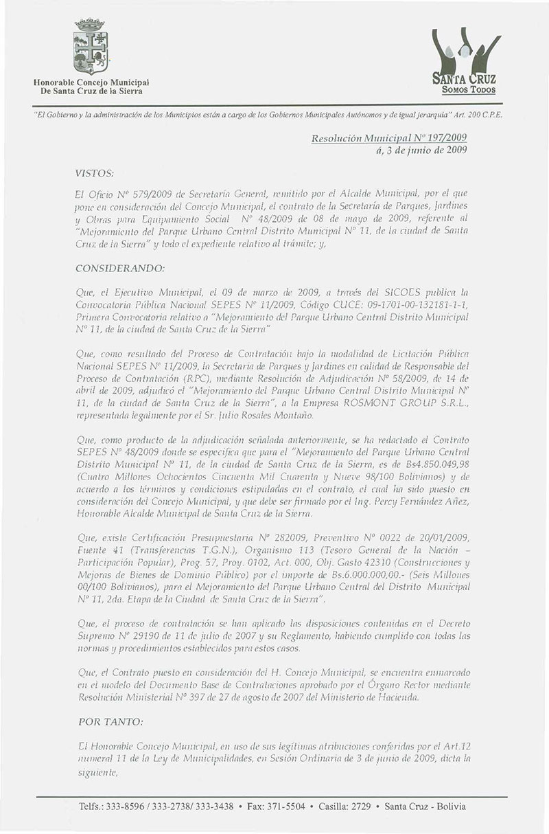 Aprueba el contrato de la Secretaria de Parques, Jardines y Obras para Equipamiento Social N° 48/2009, por el monto de Bs. 4,850,049,98.- para el "Mejoramiento del Parque Urbano Central del Distrito Municipal N° 11 de la ciudad de Santa Cruz de la Sierra.
