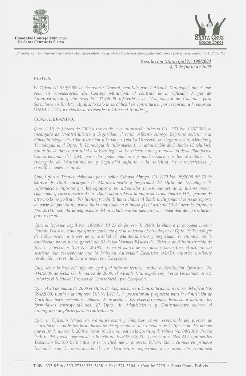 Aprueba el Contrato Oficialía Mayor de Administración y Finanzas N° 017/2009, referente a la "Adquisición de Cuchillas para Servidores en Blade" para el Departamento de Tecnología de Información de la Oficialía Mayor de Administración y Finanzas por un monto de Bs. 292,932,00.