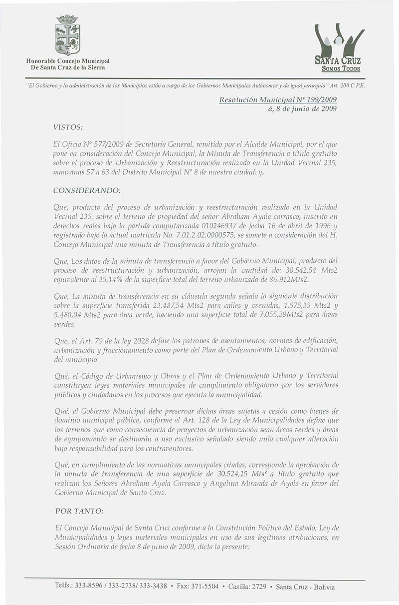 Aprueba la Minuta de Transferencia de Terrenos a Titulo Gratuito a favor del Gobierno Municipal de Santa Cruz de la Sierra, que realizan los Señores Abraham Ayala Carrasco y Angélica Miranda de Ayala, terrenos ubicados en la UV. 235, equivalente a una superficie de 30,542,54 m².
