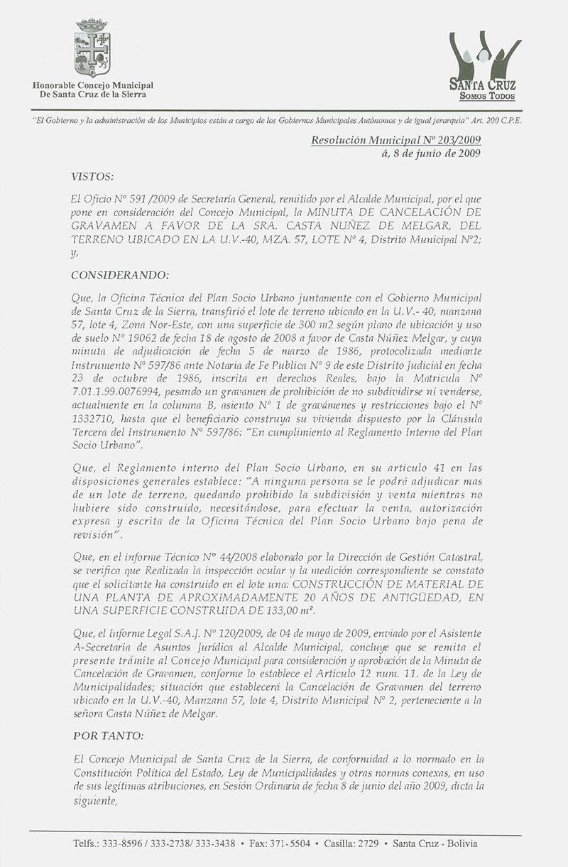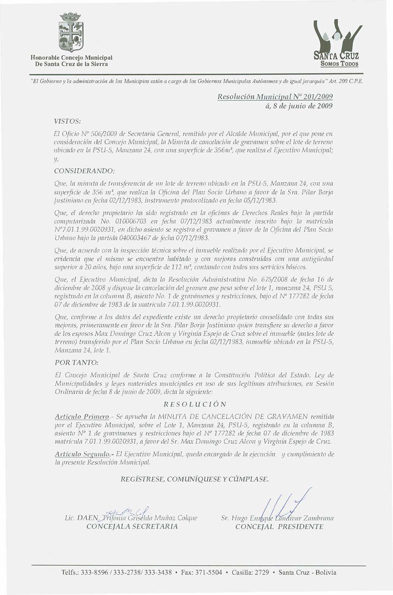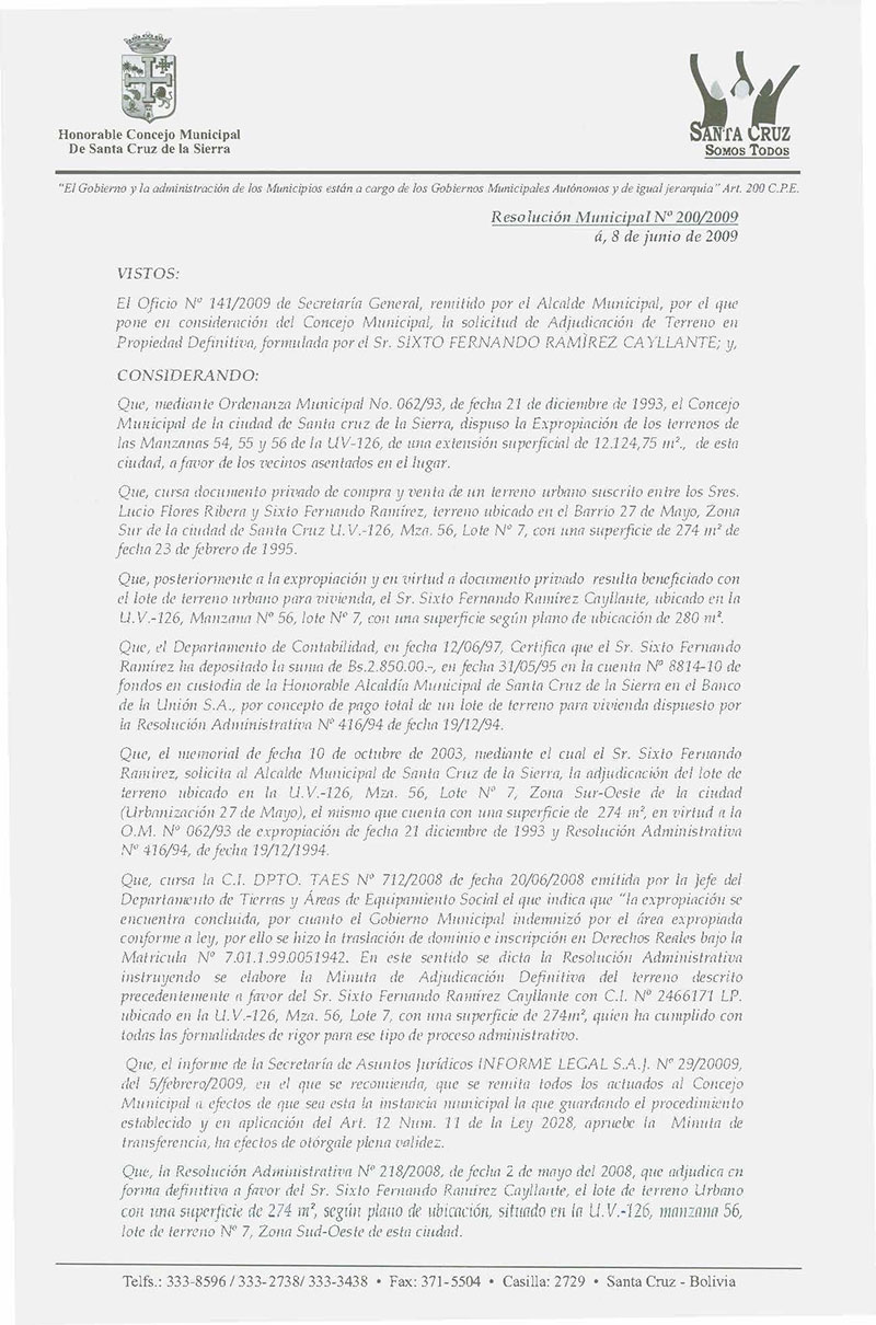 Aprueba la Minuta de Transferencia de Terreno en propiedad definitiva, a favor del Sr. Sixto Fernando Ramírez Cayllante, el mismo que esta ubicado en la UV. 126, Mza. 56, Lote N° 7, Zona Sud-Oeste de la Ciudad de Santa Cruz de la Sierra.