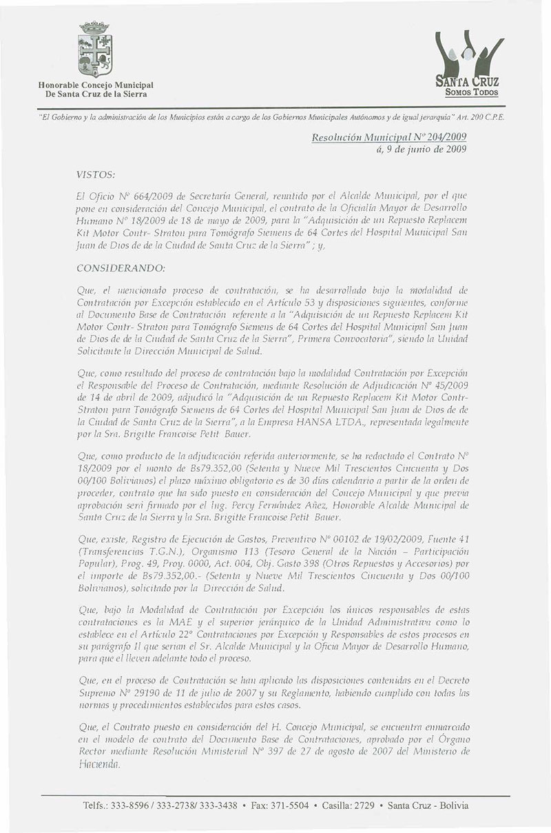 Aprueba el Contrato de la Oficialía Mayor de Desarrollo Humano N° 18/2009, para la Adquisición de un repuesto Replacem Kit Motor Contr-Straton para Tomógrafo Siemens de 64 cortes del Hospital Municipal San Juan de Dios de la ciudad de Santa Cruz de la Sierra.