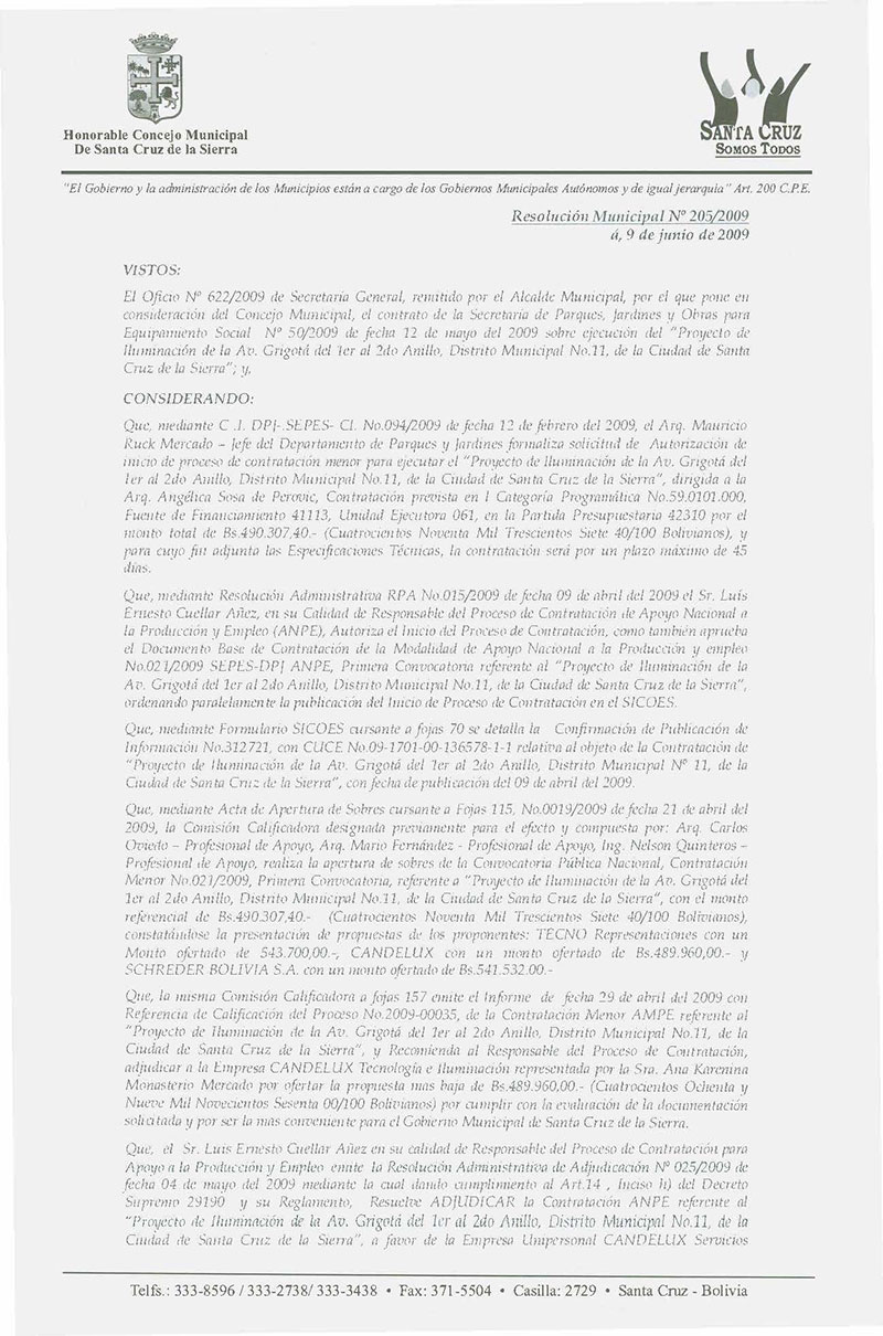 Aprueba el Contrato de la Secretaria de Parques, Jardines y Obras para Equipamiento Social N° 50/2009, para la ejecución del "Proyecto de Iluminación de la Av. Grigotá del 1er al 2do Anillo, Distrito Municipal N° 11 de la ciudad de Santa Cruz de la Sierra".