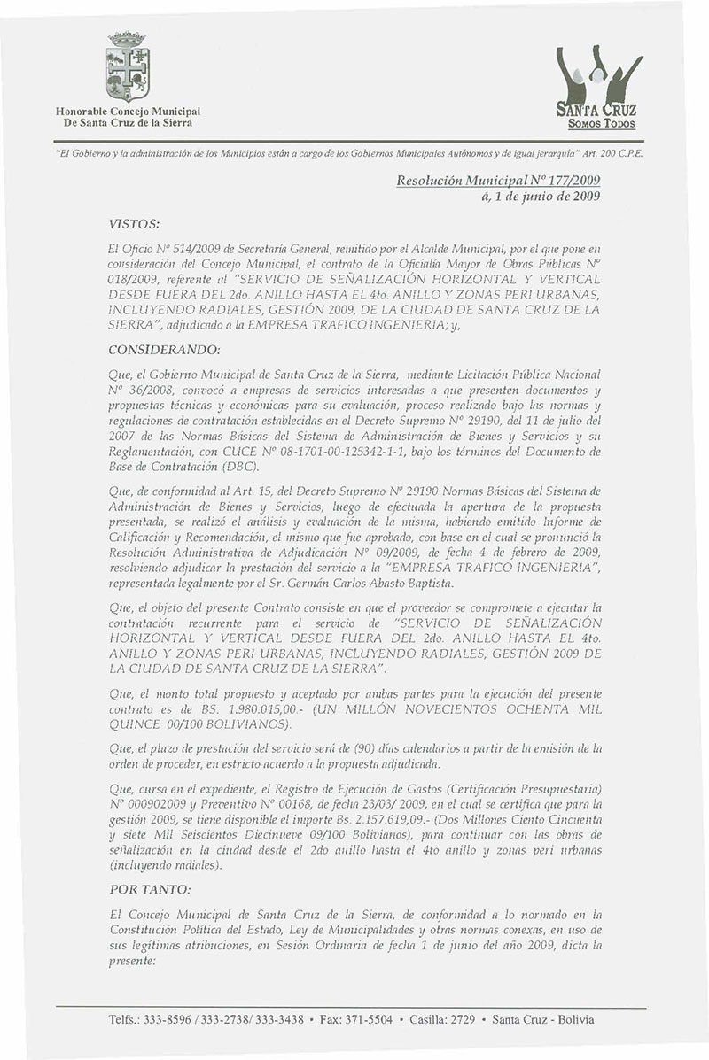 Aprueba el Contrato Oficialía Mayor de Obras Públicas N° 18/2009, referente al "Servicio de Señalización Horizontal y Vertical desde fuera del 2do anillo hasta el 4to anillo y zonas Peri Urbanas, incluyendo Radiales, Gestión 2009 de la ciudad de Santa Cruz de la Sierra.