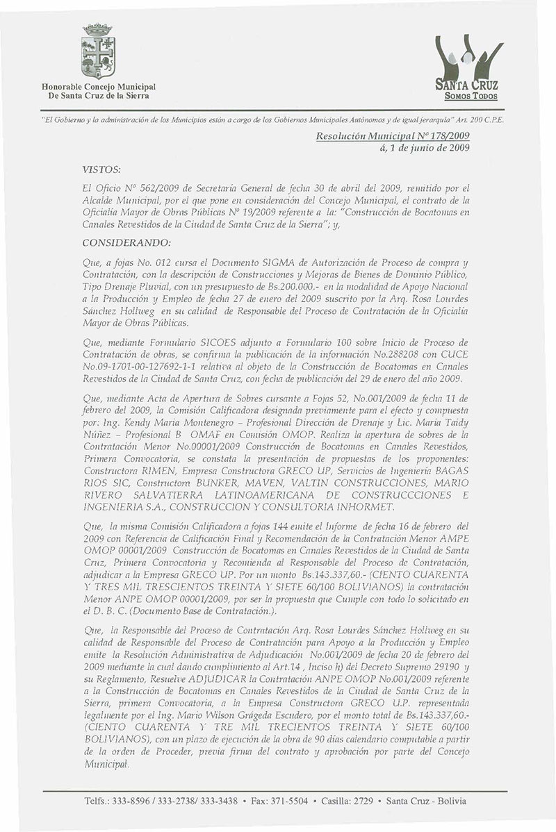 Se Aprueba el contrato Oficialía Mayor de Obras Públicas N° 019/2009, para la "Construcción de Bocatomas en Canales revestidos de la Ciudad de Santa Cruz de la Sierra" por el monto total de Bs. 143,337,60.