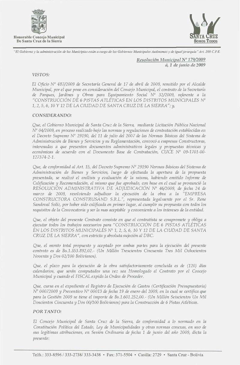 Aprueba el Contrato de la Secretaría de Parques, Jardines y Obras para Equipamiento Social N° 32/2009, referente a la "Construcción de 6 Pistas Atléticas en los Distritos Municipales N° 1,2,5,6,10 y 12 de la Ciudad de Santa Cruz de la Sierra.