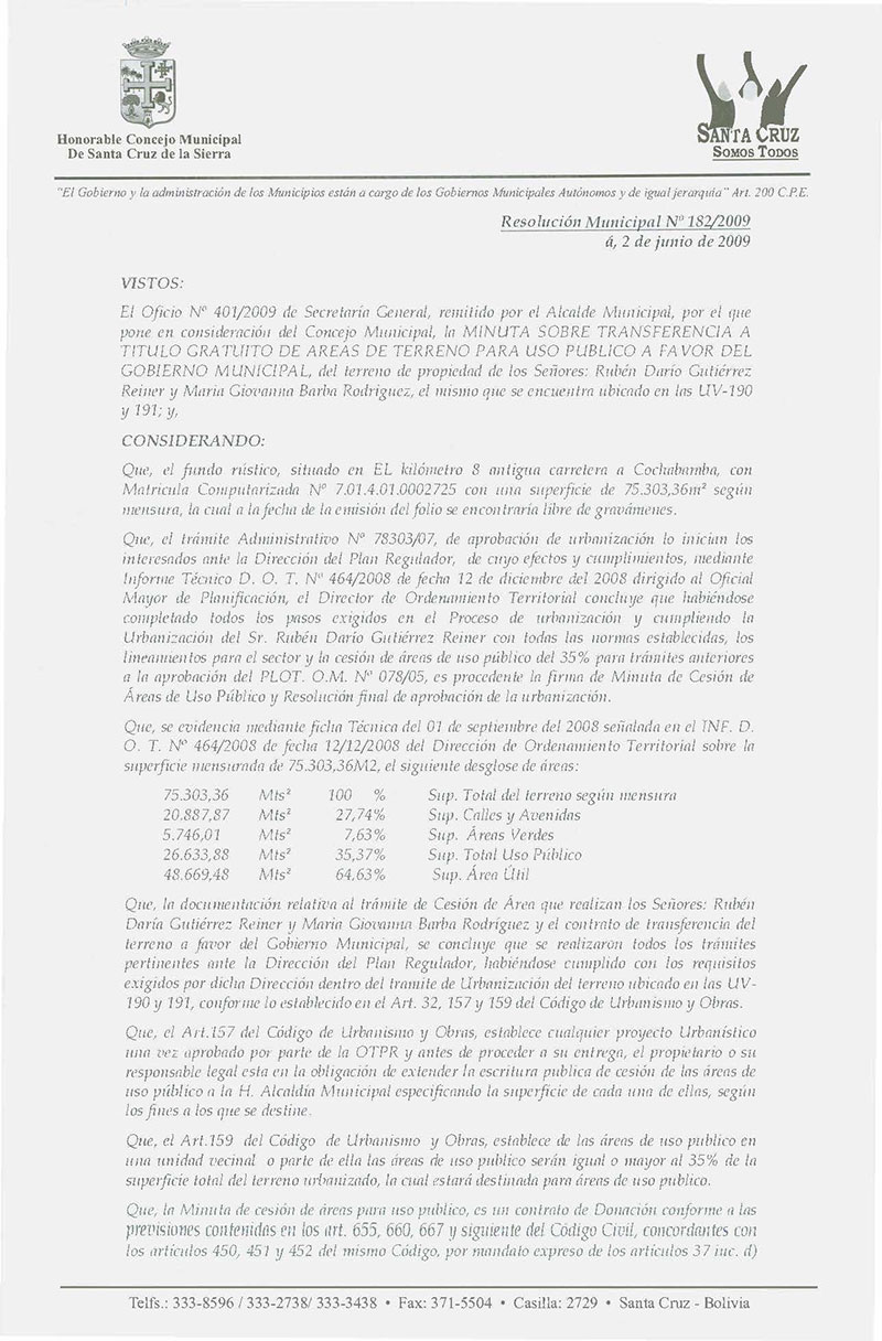Aprueba la Minuta de Transferencia a Título Gratuito de Cesión de Área, que realizan los Señores: Rubén Darío Gutiérrez Reiner y María Giovanna Barba Rodríguez, a favor del Gobierno Municipal de Santa Cruz situado en el kilómetro 8 antigua Carretera a Cochabamba, Distrito Municipal N° 10.
