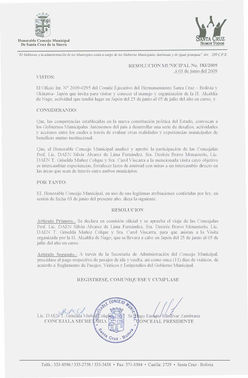 Declara en comisión Oficial y se aprueba el viaje de las Concejalas Prof. Lic. DAEN Silvia Álvarez de Lima Fernández, Sra. Desireé Bravo Monasterio, Lic. DAEN Griselda Muñoz Colque y Sra. Carol Viscarra para que asistan a la Visita organizada por la H. Alcaldia de Nago; que se llevara a cabo en Japón del 25 de junio al 05 de julio del año en curso.