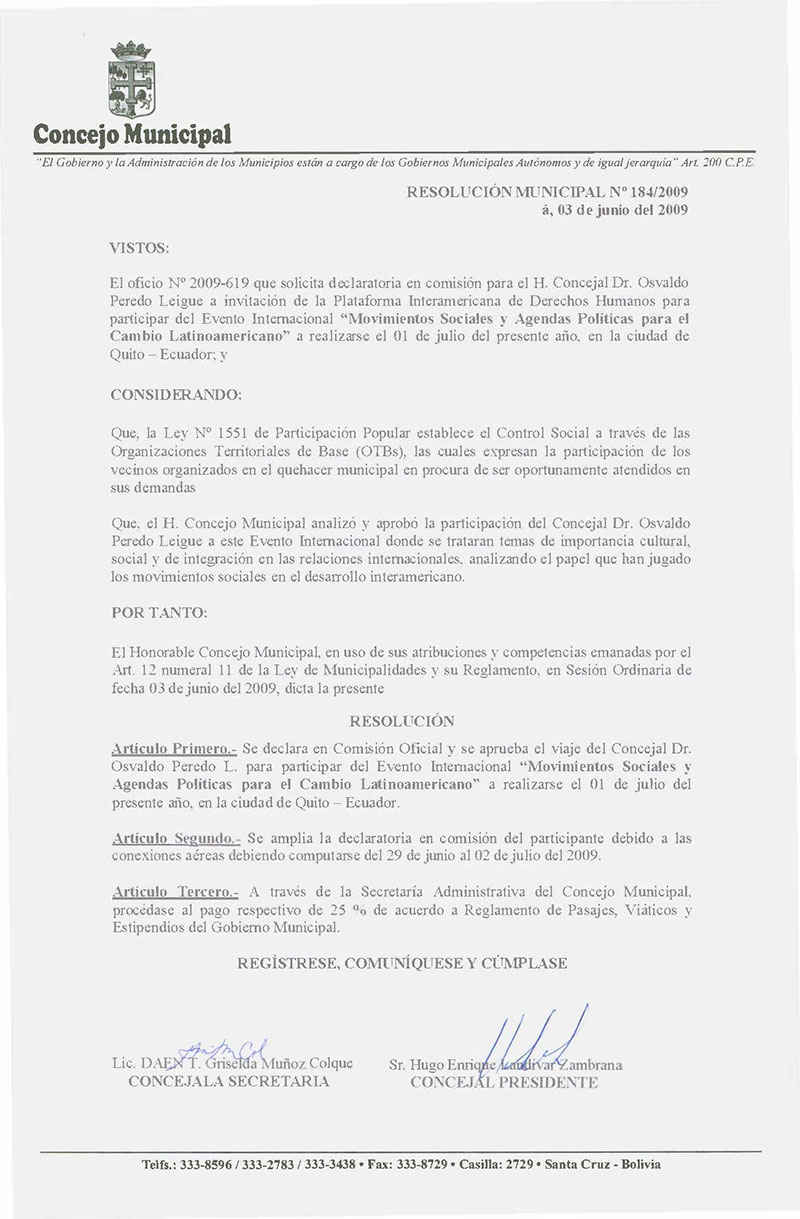 Declara en Comisión Oficial y se aprueba el viaje del Concejal Dr. Osvaldo Peredo L. para participar del Evento Internacional "Movimientos Sociales y Agendas Políticas para el cambio Latinoamericano", a realizarse el 01 de julio del presente año, en la ciudad de Quito - Ecuador.