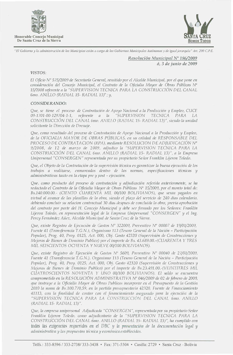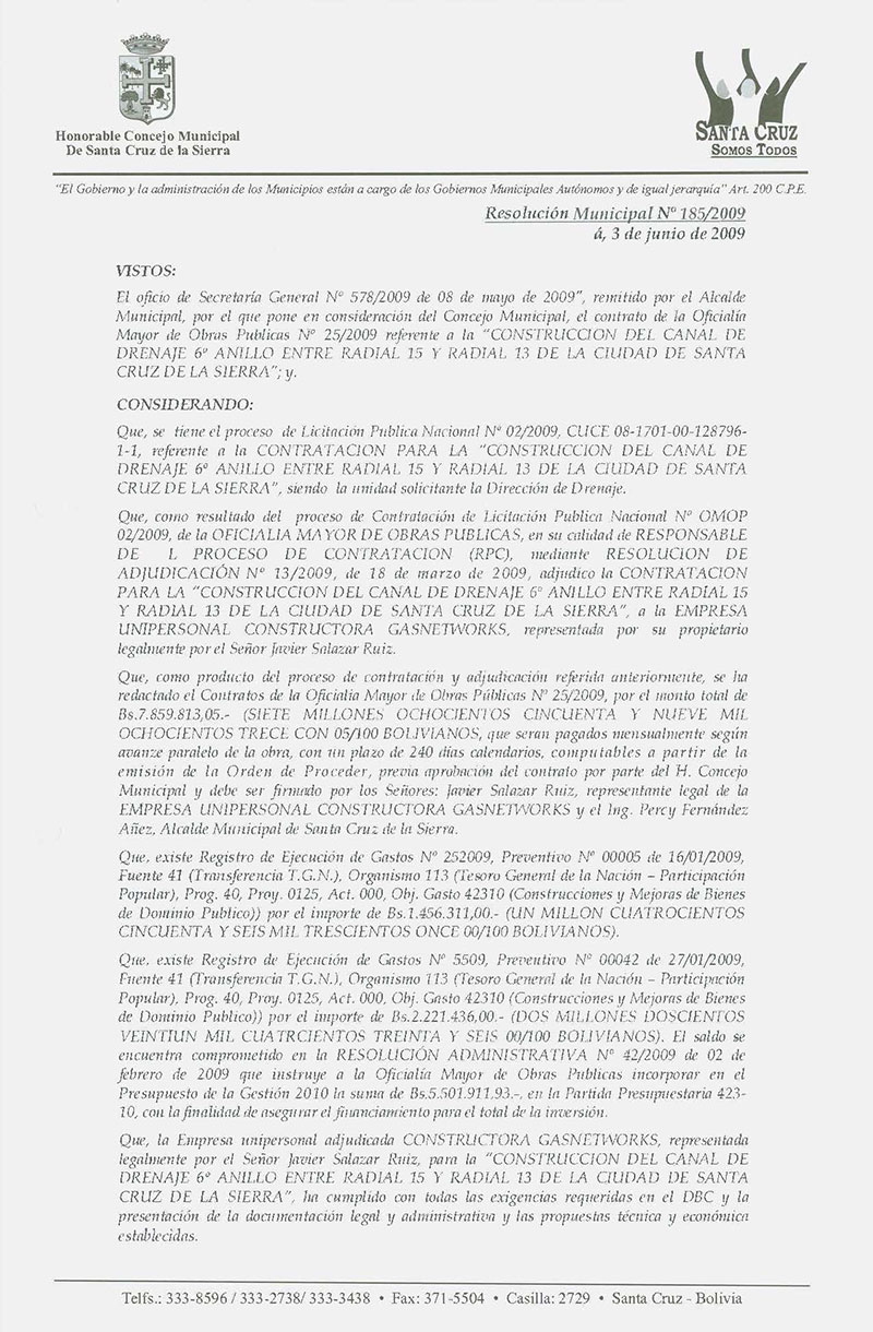 Aprueba el Contrato de la Oficialía Mayor de Obras Públicas N° 25/2009, referente a la "Construcción del Canal de Drenaje 6to Anillo entre Radial 15 y Radial 13 de la Ciudad de Santa Cruz de la Sierra, adjudicado a la Empresa Unipersonal Constructora Gasnetworks.