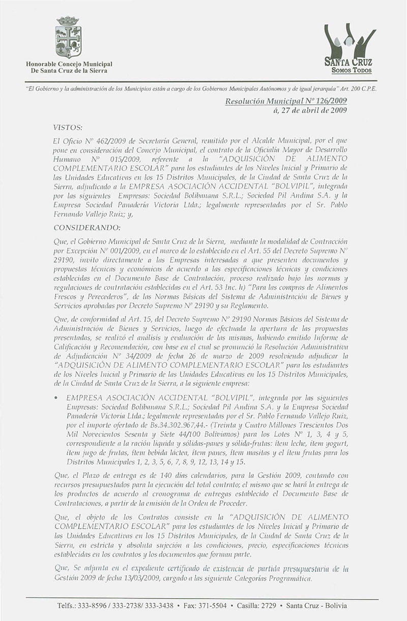 Se aprueba el Contrato de la Oficialía Mayor de Desarrollo Humano N° 015/2009, referente a la "Adquisición de Alimento Complementario Escolar" para la Unidades Educativas en los 15 Distritos Municipales de la ciudad de Santa Cruz de la Sierra.