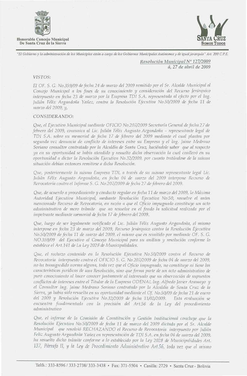 Confirma la Resolución Ejecutiva N° 50/2009, de fecha 11 de Marzo dictada por el Señor Alcalde Municipal contra el Recurso de Revocatoria interpuesto en fecha 04 de marzo del 2009 por el Ing. Julián Félix Augusto Argandoña Yañez en representación de la Empresa TDI S.A.