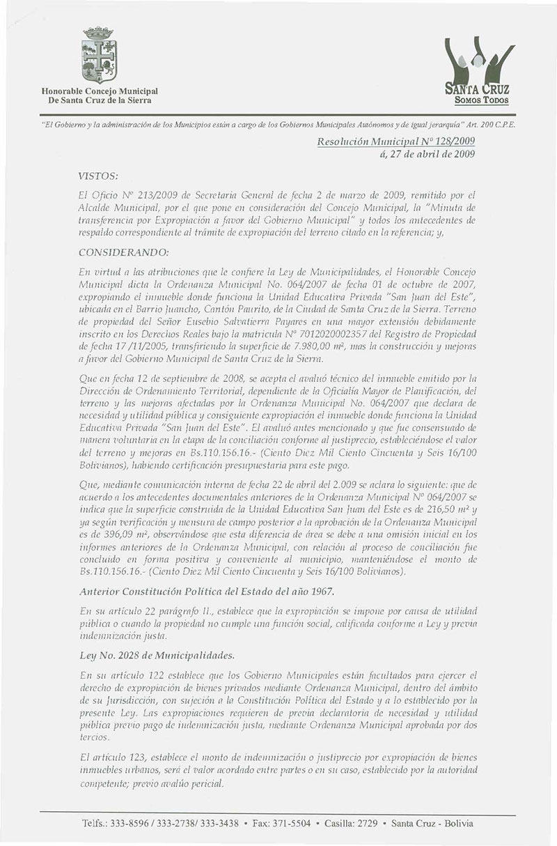 Aprueba la Minuta de Transferencia de Terreno en Propiedad Definitiva, de fecha 17 de noviembre del 2008, en atención a lo que establece la Ley N° 2028 ubicado en el Barrio Juancho, Cantón Paurito de la ciudad de Santa Cruz de la Sierra, que realiza el Sr. Eusebio Salvatierra Payares.