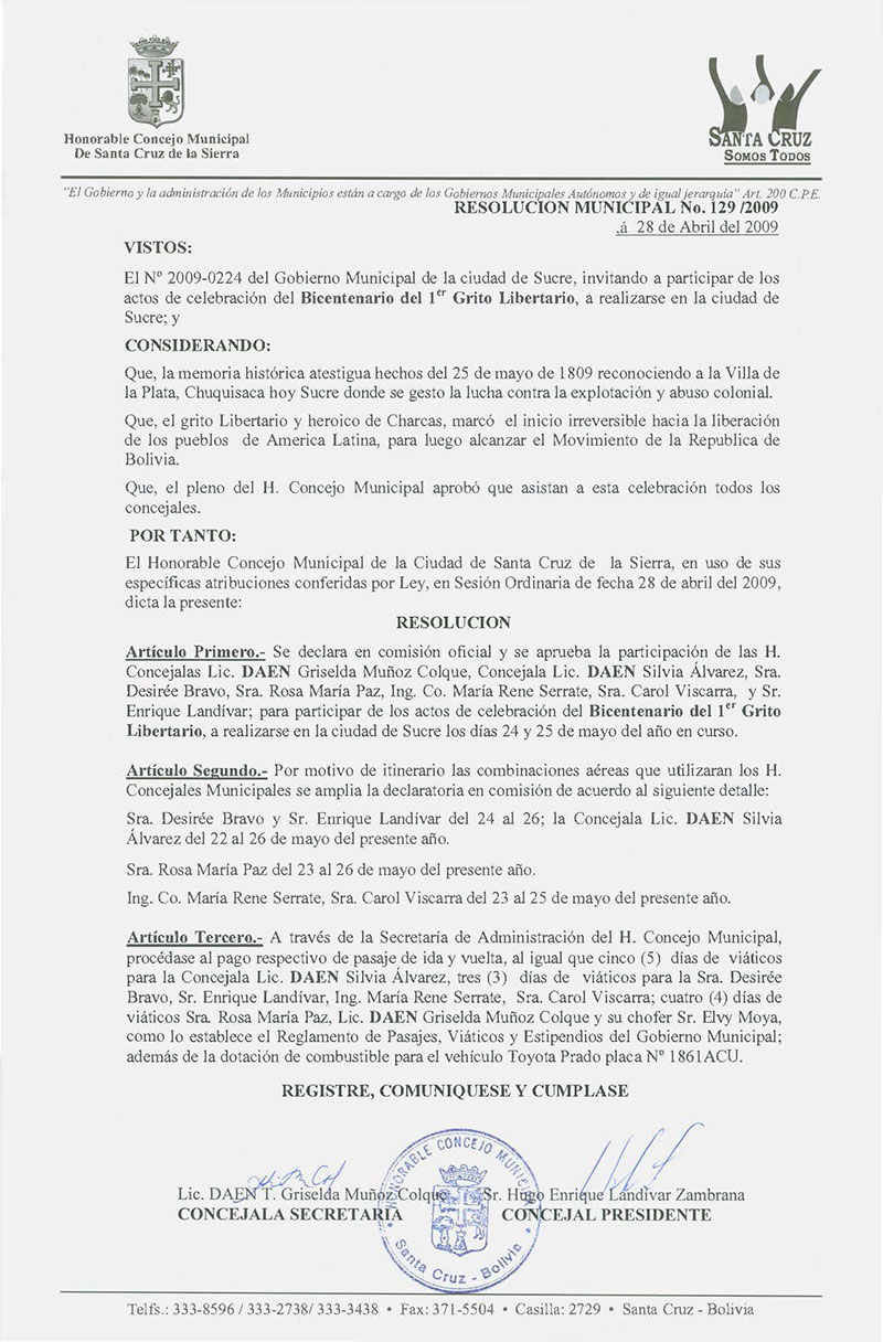 Declara en Comisión Oficial y se aprueba la participación de las H. Concejalas Lic. DAEN Griselda Muñoz Colque, Concejala Lic. DAEN Silvia Álvarez, Sra. Desiree Bravo, Sra. Rosa María Paz, Ing. Co. María René Serrate, Sra. Carol Viscarra y Sr. Enrique Landivar para participar de los actos de Celebración del Bicentenario del 1er Grito Libertario, a realizarse en la Ciudad de Sucre los días 24 y 25 de mayo del año en curso.