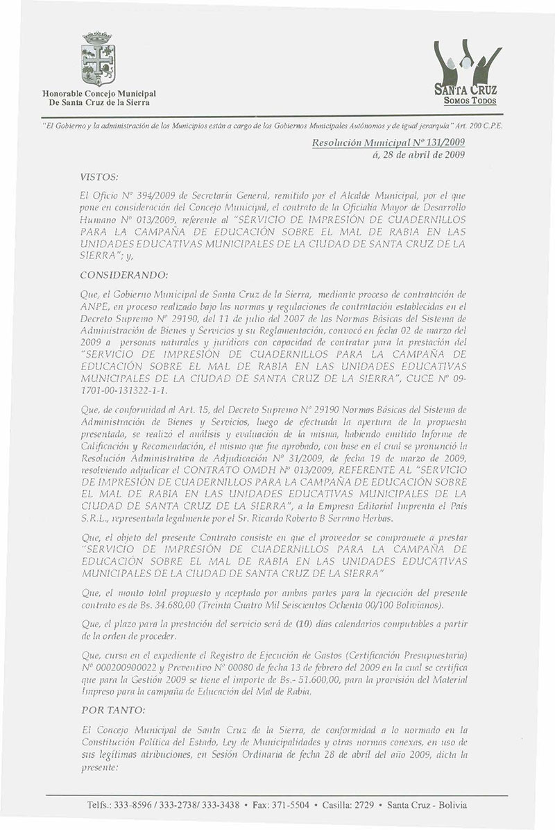 Se aprueba el Contrato de la Oficialía Mayor de Desarrollo Humano N° 013/2009, referente al Servicio de Impresión de Cuadernillos para la Campaña de Educación sobre el Mal de Rabia en las Unidades Educativas Municipales de la Ciudad de Santa Cruz de la Sierra.