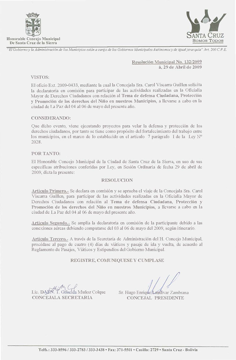 Declara en Comisión y se aprueba el viaje de la Concejala Sra. Carol Viscarra Guillen, para participar de las actividades realizadas en la Oficialía Mayor de Derechos Ciudadanos con relación al Tema de Defensa Ciudadana, Protección y Promoción de los Derechos del Niño en nuestros Municipios, a llevarse a cabo en la Ciudad de La Paz del 04 al 06 de mayo del presente año.