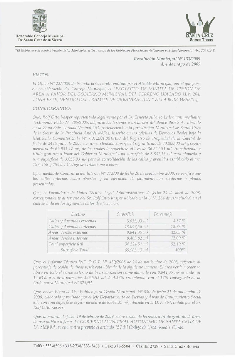 Aprueba el Proyecto de Minuta de Cesión de área a favor del Gobierno Municipal del Terreno ubicado en la UV. 264, Zona Este, dentro del Trámite de Urbanización "Villa Borghese", que realiza el Sr. Rolf Otto Kasper.